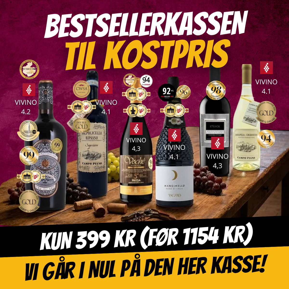 Vi har samlet seks af vores absolutte største publikumsfavoritter i én kasse, og vi sælger dem til ren kostpris. Ja, du læste rigtigt. Vi tjener 0 kroner på den her kasse – til gengæld får du en vinoplevelse, der får englene til at synge.