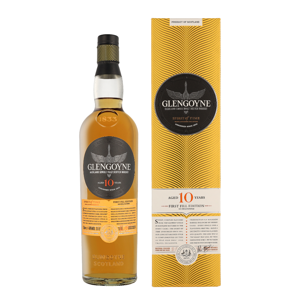 Glengoyne 10 års First Fill Highland Single Malt er ren og balanceret i smagen med noter af grønne æbler, karamel, lidt lakrids og et sødt præg. En whisky, der viser Glengoyne Distillerys høje niveau.
