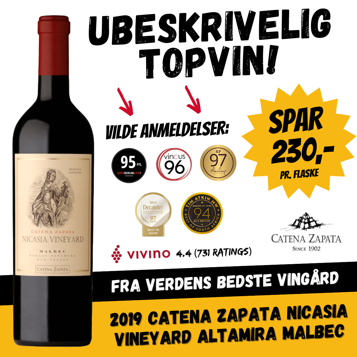 Her får du en TOP TOP TOP RØDVIN "Catena Zapata Nicasia Vineyard Altamira Malbec" i den imponerende 2019 årgang! Vilde 4,4 på Vivino med hele 713 anmeldelser! Leveres i flot original 6 stk. trækasse - OBS. Husk at du skal bestille "flexlevering" hvis du skal have trækassen med.