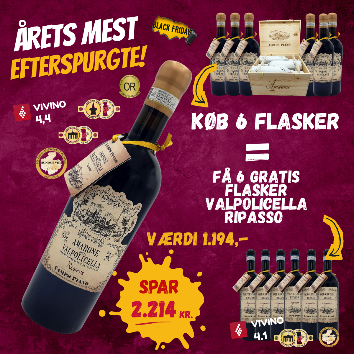Et MEGET efterspurgt tilbud er tilbage. Du får GRATIS 6 flasker Valpolicella Ripasso Superiore 15% Campo Piano med på toppen, når du køber 1 kasse af vores imponerende, vilde, fantastiske Amarone della Valpolicella Riserva 17% Campo Piano!