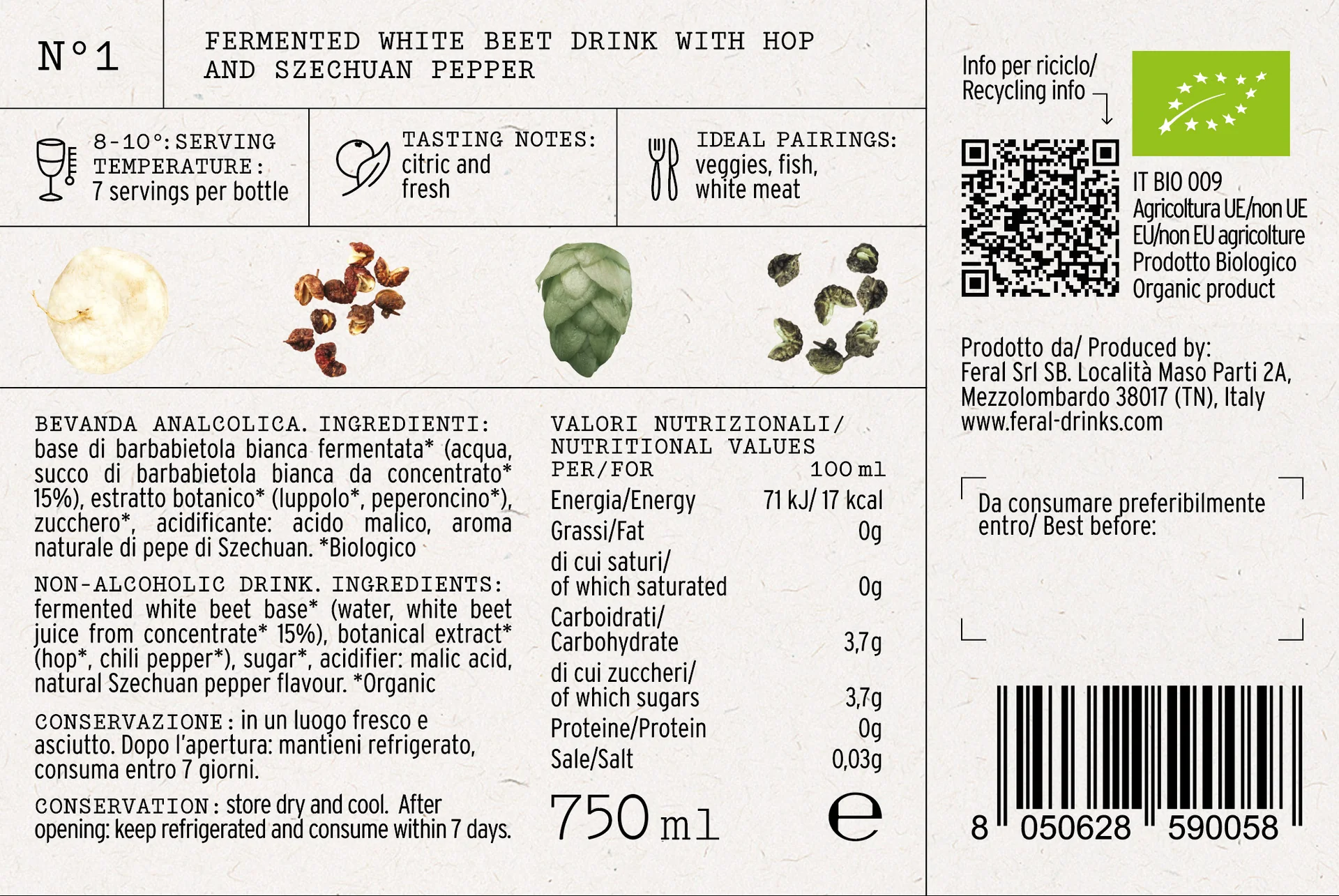 fermenteret hvid rødbede-base* (vand, hvid rødbedesaft fra koncentrat* 15%), botanisk ekstrakt* (humle*, chilipeber*), sukker*, syreholder: æblesyre, naturlig Szechuan-pebersmag. *Økologisk
