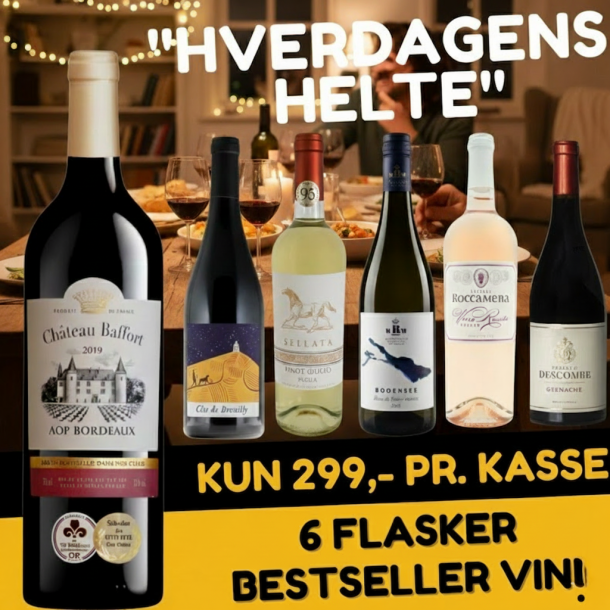 Vi har lavet en "hverdagens helte" vinkasse. 6 flasker til KUN 299,- pr. kasse. Hverdagens Helte er en vinkasse til hverdagen. Til aftener på sofaen. Til hurtig pasta. Til “skal vi ikke lige åbne en flaske?”. Til de dage, hvor der ikke er nogen særlig anledning – udover at du har fortjent et godt glas vin til en super pris!