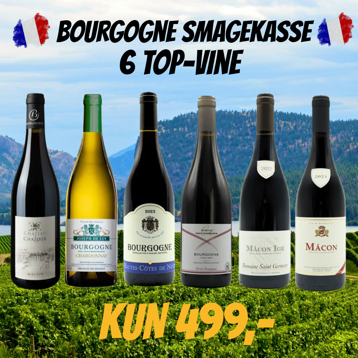 NYHED! Vi har lavet en LÆKKER BOURGOGNE SMAGEKASSE med 6 flasker rigtig, rigtig god vin til KUN 499,- pr. kasse. Det er alle super populære vine fra BOURGOGNE! Se lige disse super skønne og meget populære vine, som alle byder på en dejlig smagsoplevelse.